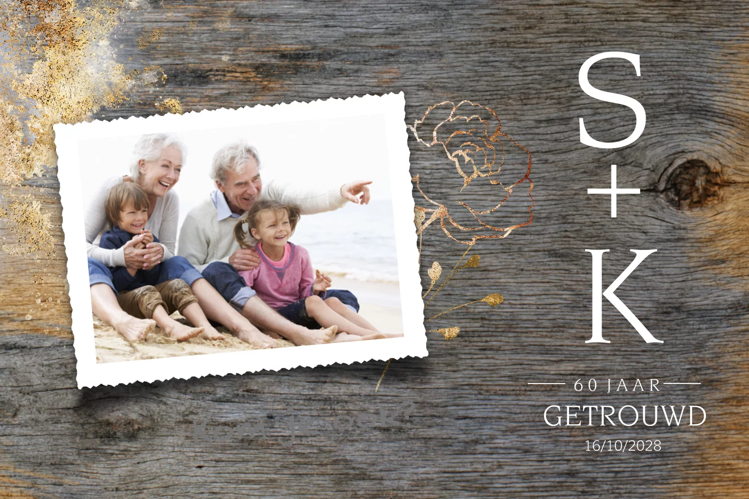 Stijlvolle uitnodiging voor jullie 60 jarig huwelijksjubileum. Ondergrond hout look. Versierd met fotokader voor jullie eigen foto, goudkleurige spetters en bloemen. (geen echt goud)