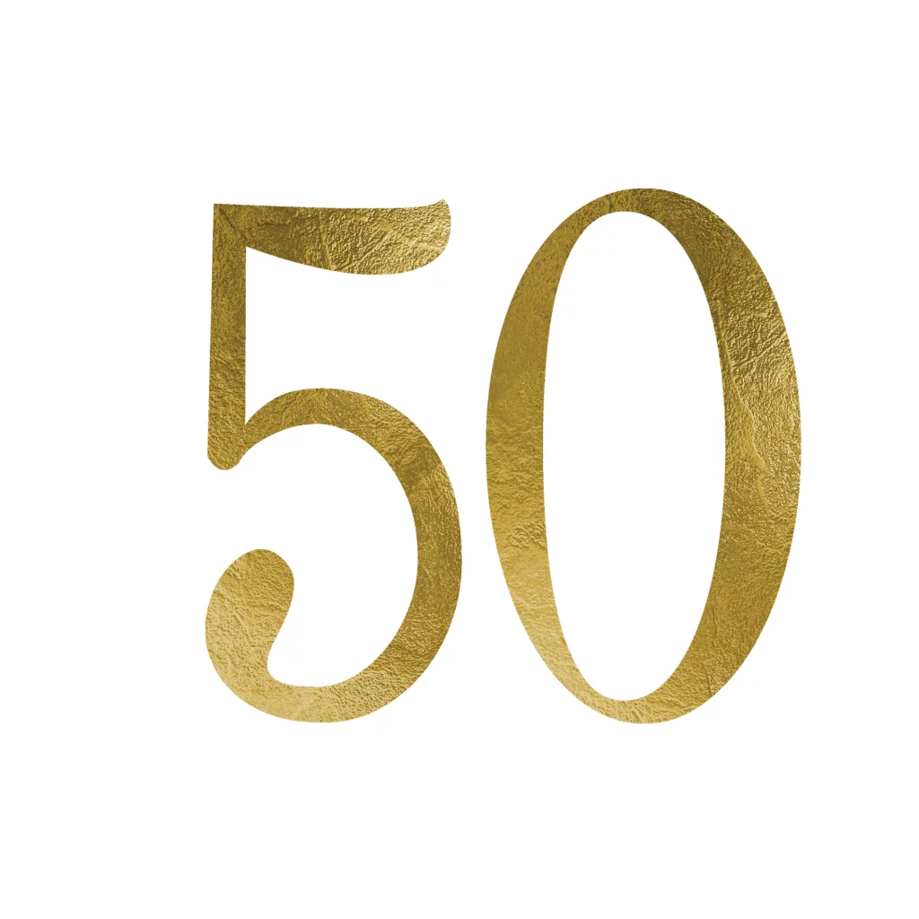 Deze sluitzegel met 50 goudlook op een witte ondergrond kun je zelf aanpassen. Zelf klevend voor envelop.