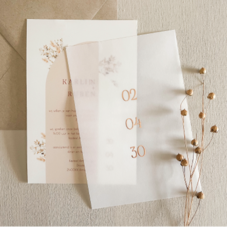 Het voorstel blad van je trouwkaart, van kalkpapier of calco. Dit papier is doorzichtig. De tekst is afgebeeld in rosegoudfolie. Andere kleur folie? Pas dit aan in de editor en kies een folie of inktkleur van je keuze. Teksten en cliparts zijn eenvoudig toe te voegen in de editor!