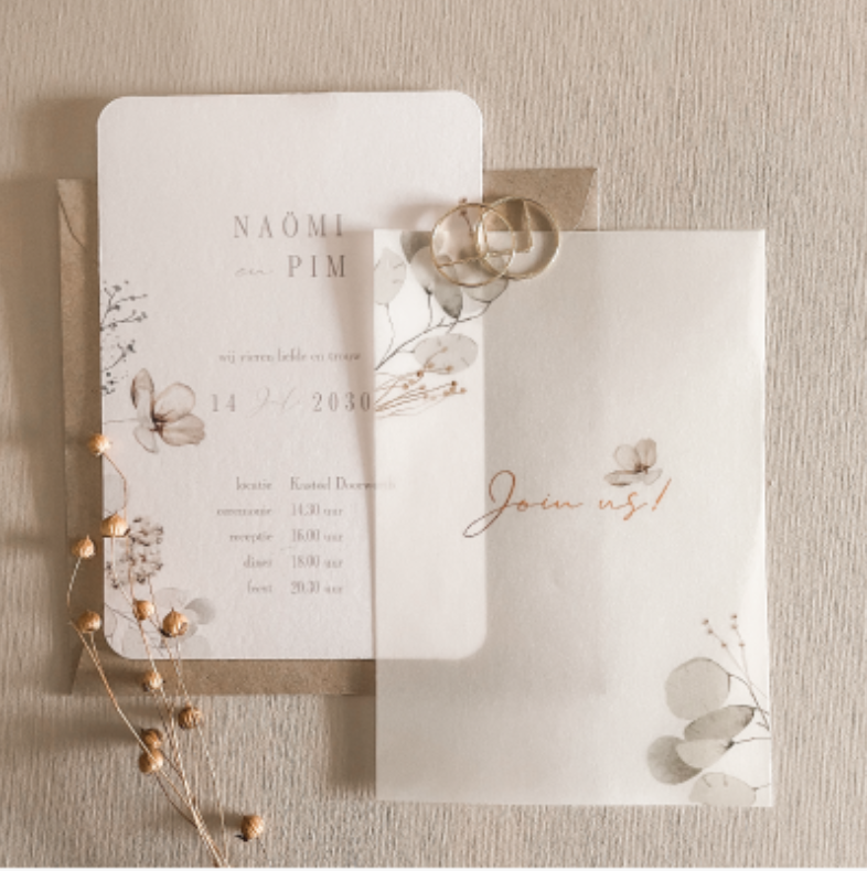 Voorblad gedrukt op kalkpapier. LET OP: Kalk papier is niet geschikt voor witte inkt. De achterkant kan je niet bedrukken.