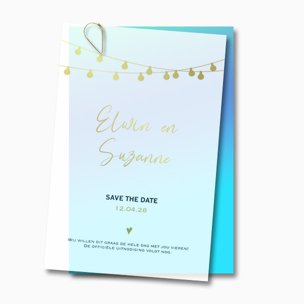 Save the date trouwkaart festival lampjes goudfolie kalkpapier
