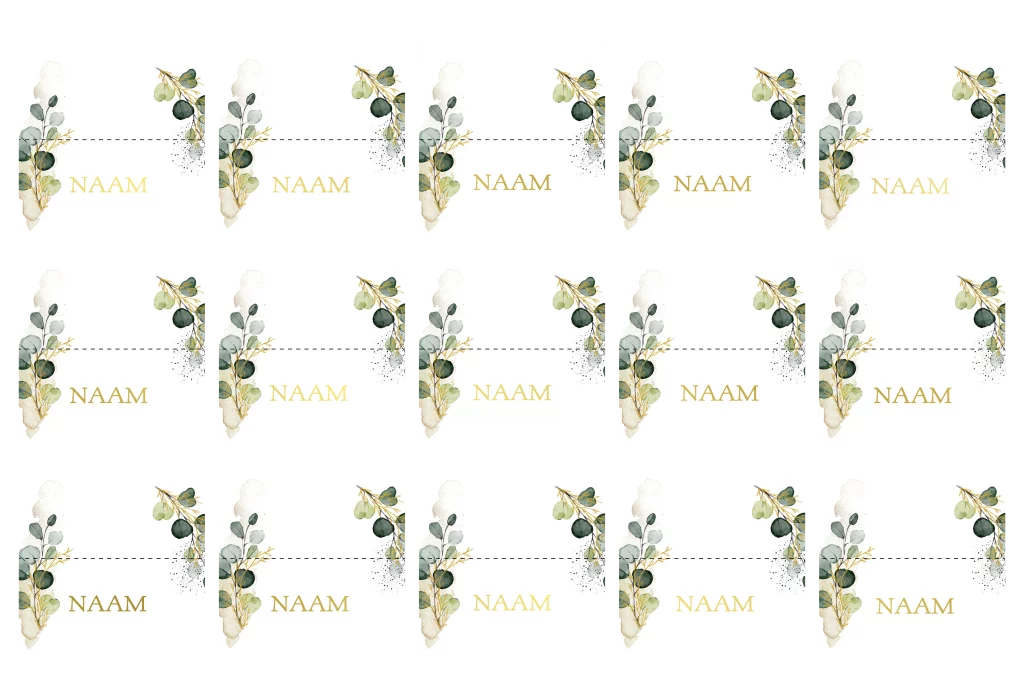 Maak jullie bruiloft compleet en bestel naamkaartjes in de stijl van jullie trouwkaart. Pas gemakkelijk het design zelf aan en ga aan de slag met onze editor. Voeg zo super simpel elementen zelf toe of verwijder details, die jij minder mooi vindt. Wist je dat je met een lettertype bijvoorbeeld een hele andere look kan creëren? Specificaties: • 15 stuks per vel. • Formaat: 8x4 cm. • Enkelzijdig bedrukt. • Papiersoort: coated karton. Tip van onze makers: • Gebruik de naamkaartjes ook tijdens jullie ceremonie als plaatskaartjes.