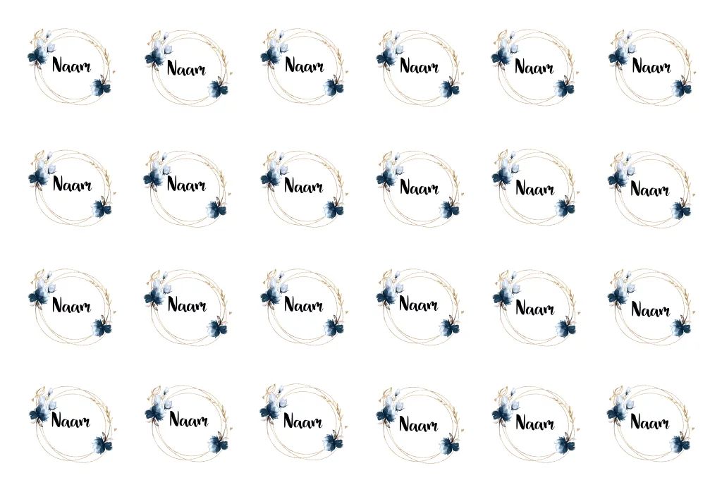 Maak jullie bruiloft compleet en bestel naamkaartjes in de stijl van jullie trouwkaart. Pas gemakkelijk het design zelf aan en ga aan de slag met onze editor. Voeg zo super simpel elementen zelf toe of verwijder details, die jij minder mooi vindt. Wist je dat je met een lettertype bijvoorbeeld een hele andere look kan creëren? Specificaties: • 24 stuks per vel. • Formaat: 6x6 cm. • Enkelzijdig bedrukt. • Papiersoort: coated karton. Tip van onze makers: • Gebruik de naamkaartjes ook tijdens jullie ceremonie als plaatskaartjes.
