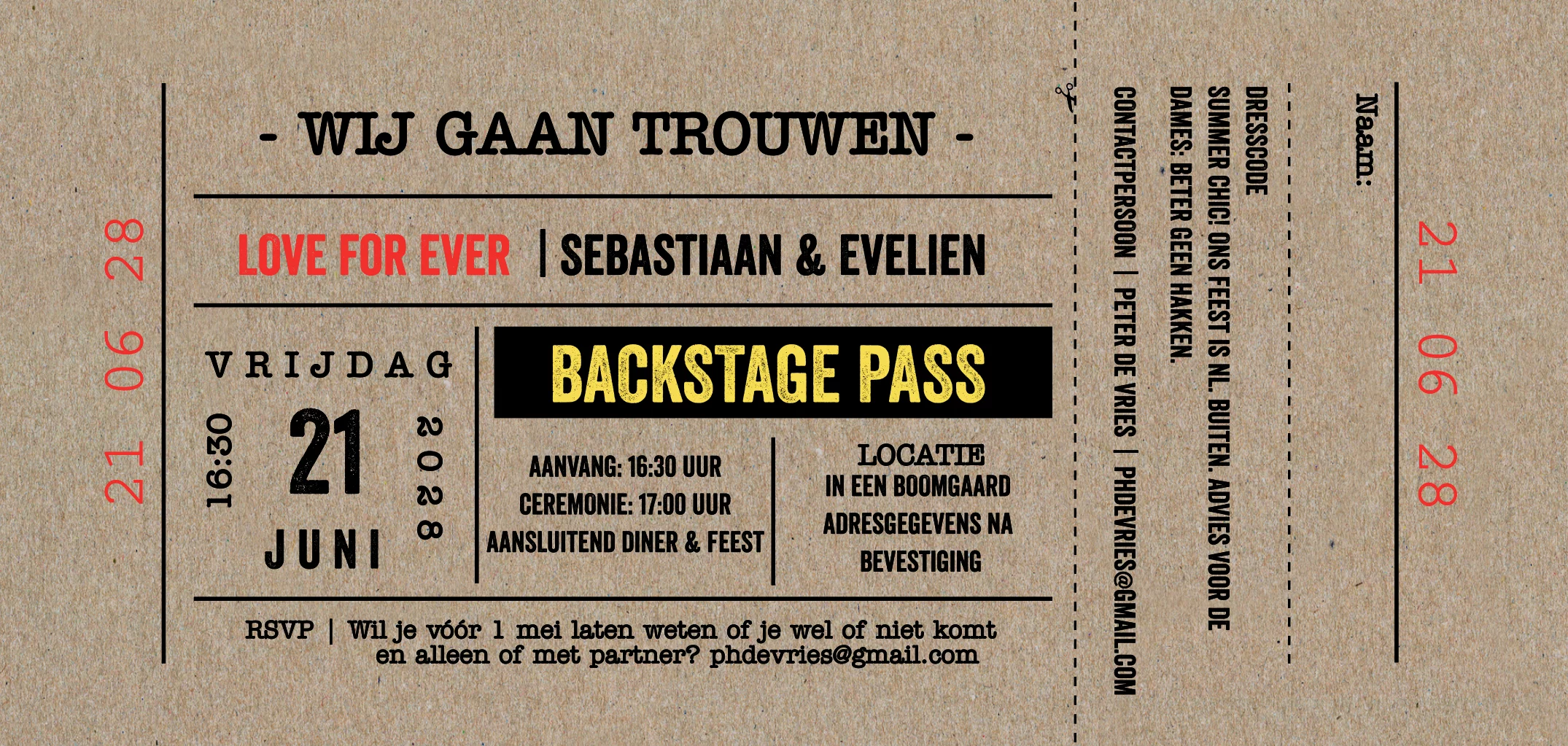 Opzoek naar een hippe panorama trouwkaart die lijkt op een toegangskaart van festival of concert? Stans trouwkaart op echt kraft op de ondergrond en lijn grid. Teksten zijn allemaal aan te passen. Zelf maken.