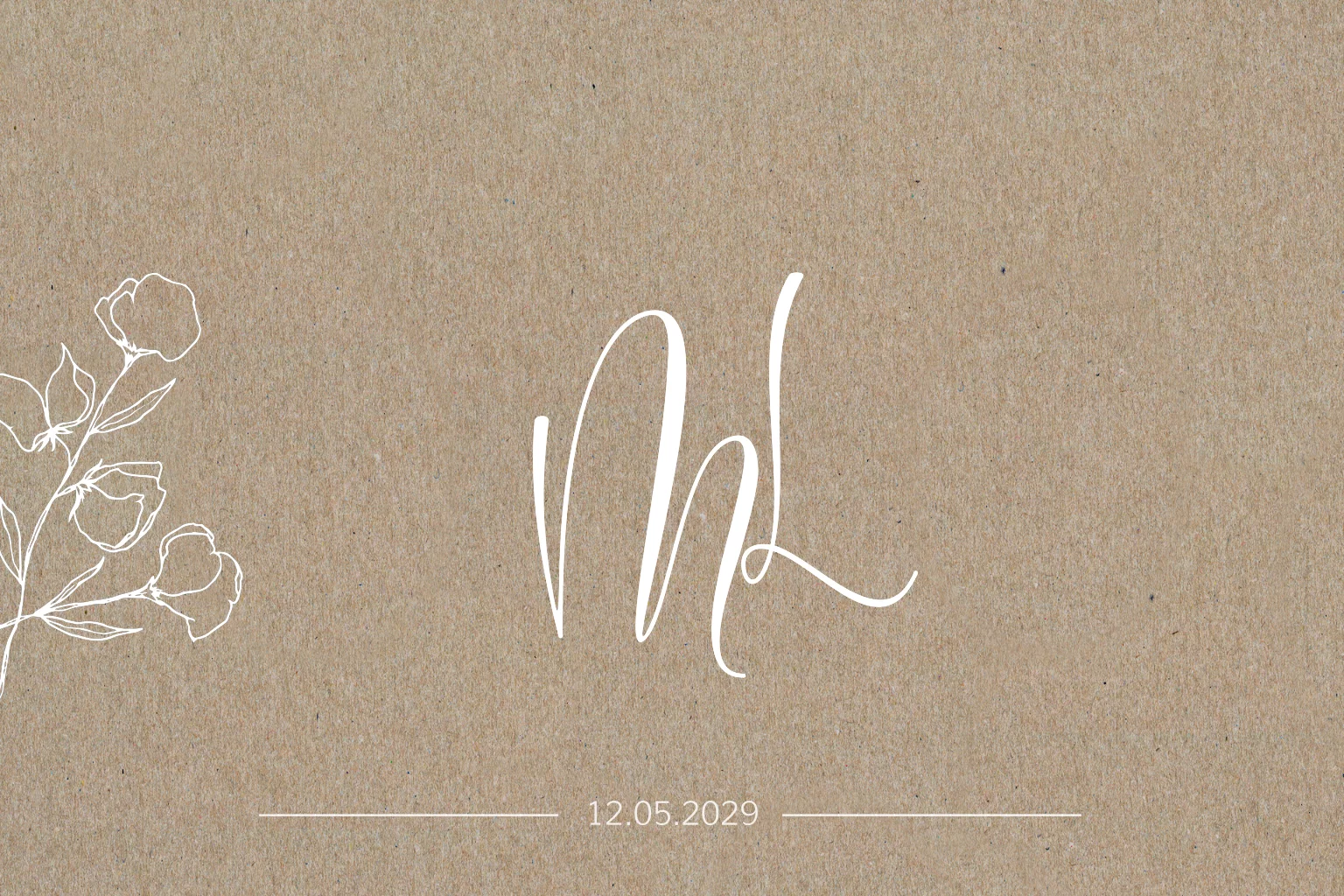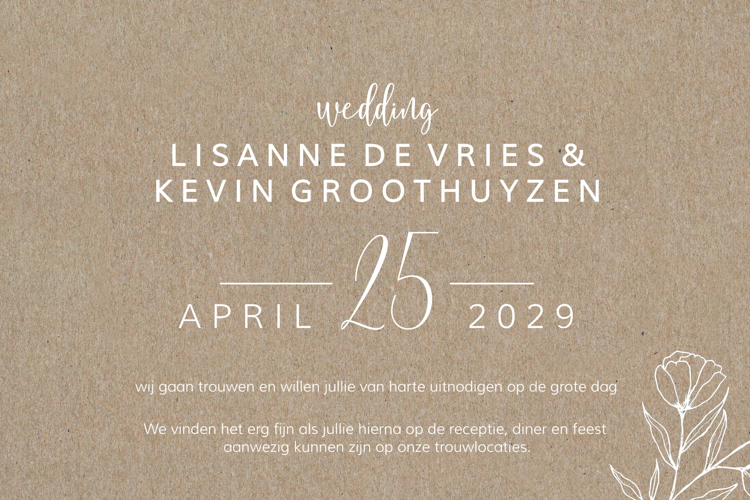 Minimalistische dubbele klapkaart trouwkaart met de echt kraft papier ondergrond met lijntjes en outline bloem. Beeldmerk van de namen. Alles staat los en is zelf te bewerken.