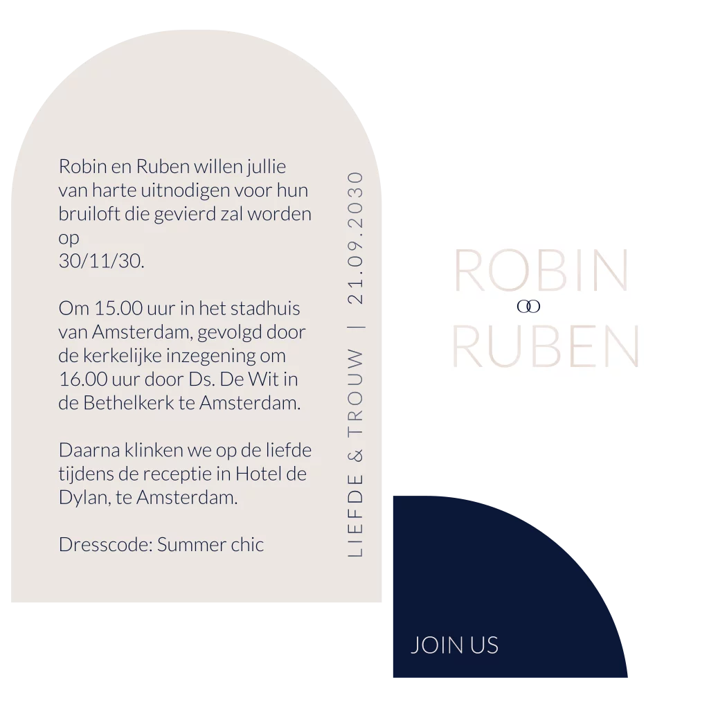 Hippe blauw zandkleurig trouwkaart stapelkaart