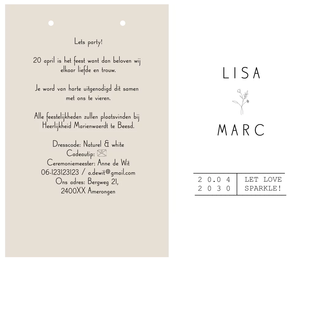 Moderne trouwkaart 2 kaartjes met boorgaatjes