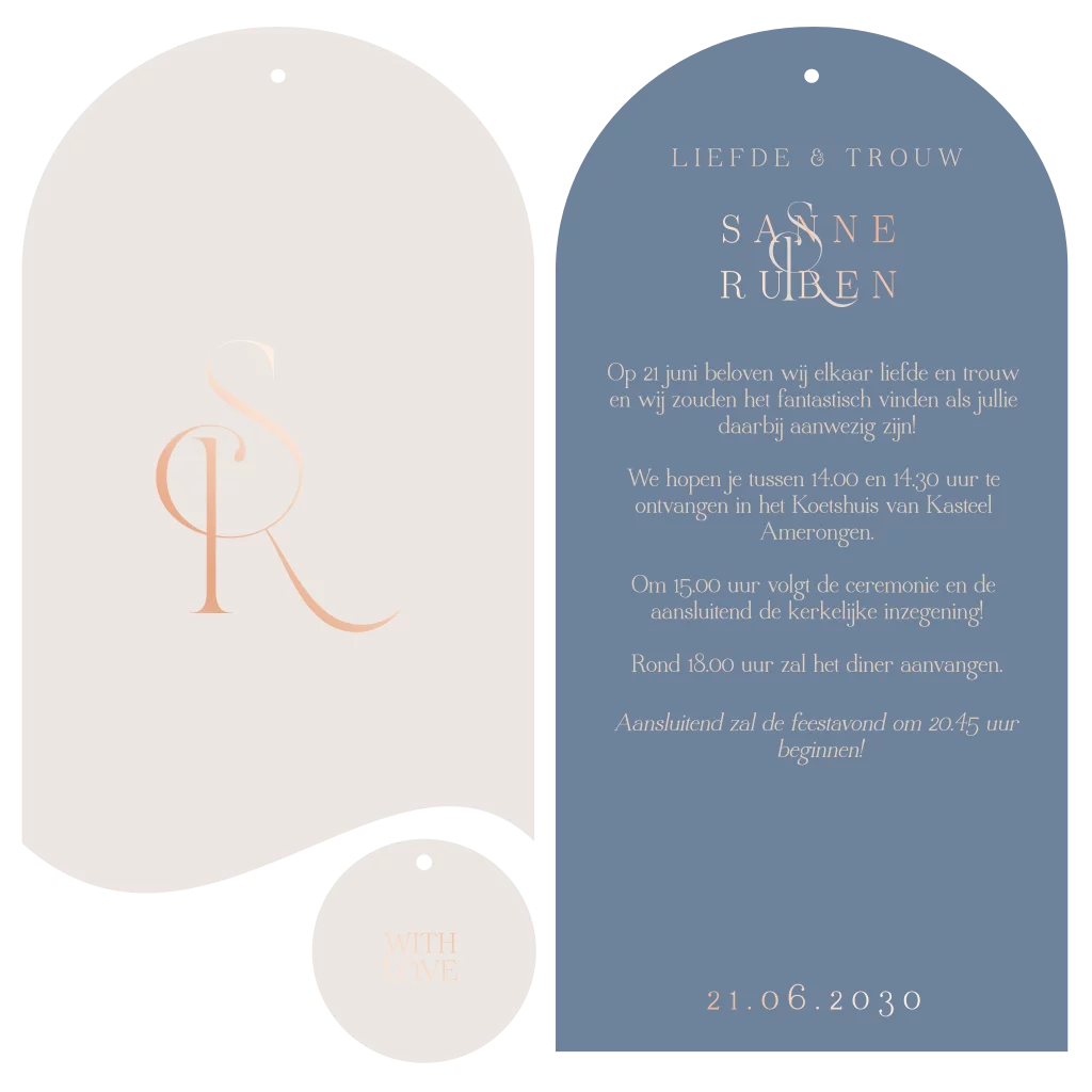 Let op: omdat je kunt kiezen voor verschillende soorten bevestigingsmateriaal, zoals een touwtje of paperclip bestel je het bevestigingsmateriaal van jouw voorkeur los bij de kaart. Wanneer je deze trouwkaart thuis krijgt, zet je ze hiermee zelf in elkaar.