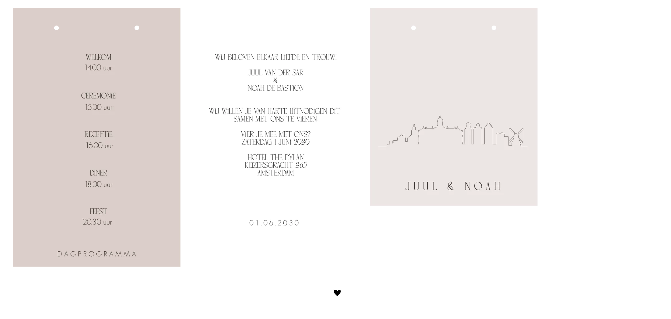 Let op: omdat je kunt kiezen voor verschillende soorten bevestigingsmateriaal, zoals een touwtje of paperclip bestel je het bevestigingsmateriaal van jouw voorkeur los bij de kaart. Wanneer je deze trouwkaart thuis krijgt, zet je ze hiermee zelf in elkaar.