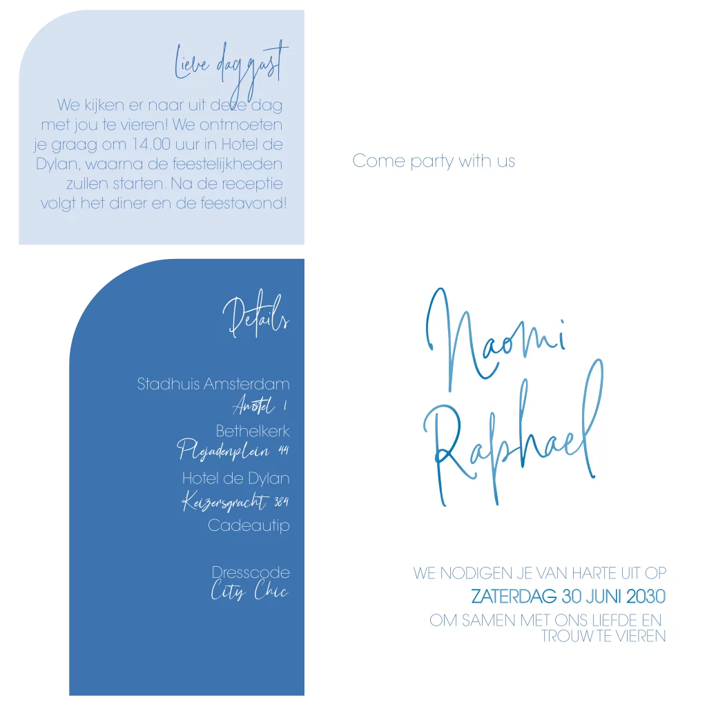 Trendy blauwe trouwkaartset met 3 kaartjes en label
