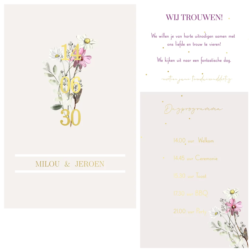 Trendy trouwkaart in 3 delen met insteekkaartjes wilde bloemen
