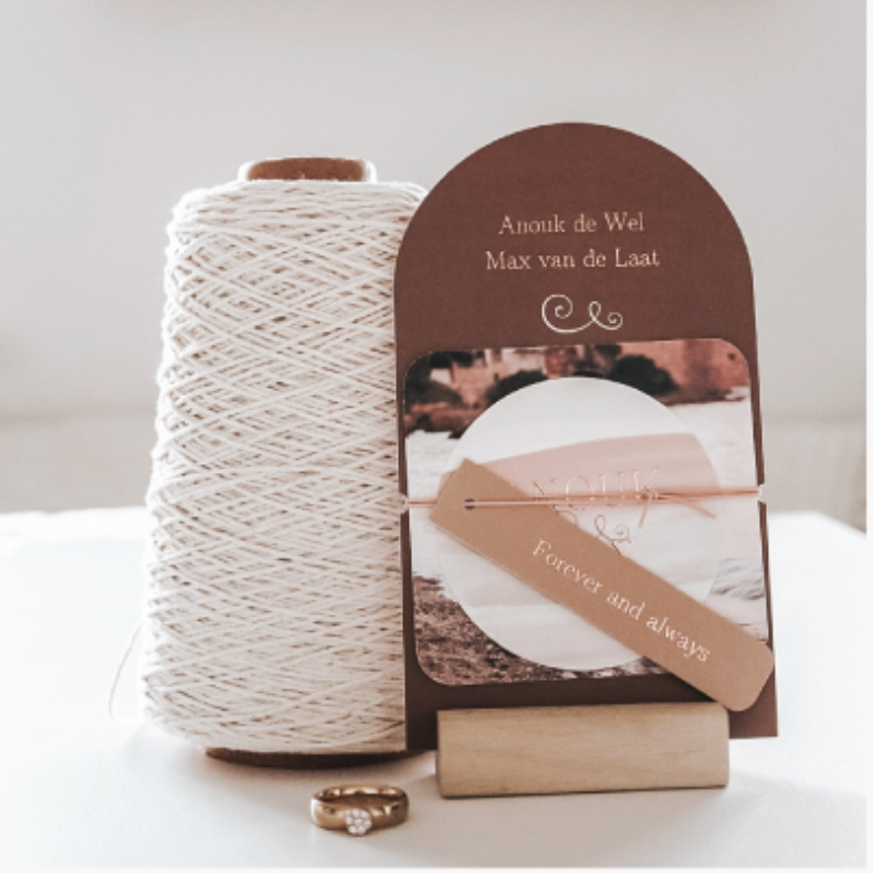 Let op: omdat je kunt kiezen voor verschillende soorten bevestigingsmateriaal, zoals een touwtje of paperclip bestel je het bevestigingsmateriaal van jouw voorkeur los bij de kaart. Wanneer je deze trouwkaart thuis krijgt, zet je ze hiermee zelf in elkaar.
