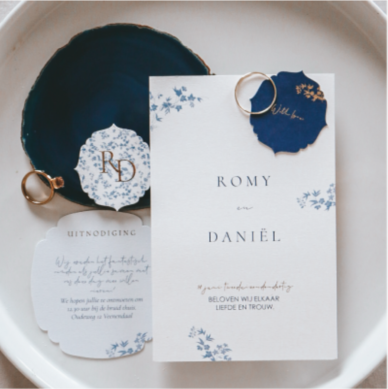 Trouwkaart in delfts blauwe kleuren en goudfolie