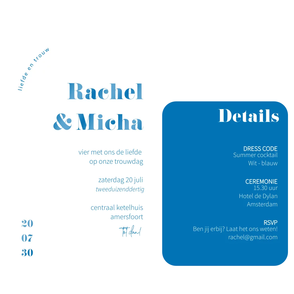 Let op: omdat je kunt kiezen voor verschillende soorten bevestigingsmateriaal, zoals een touwtje of paperclip bestel je het bevestigingsmateriaal van jouw voorkeur los bij de kaart. Wanneer je deze trouwkaart thuis krijgt, zet je ze hiermee zelf in elkaar.