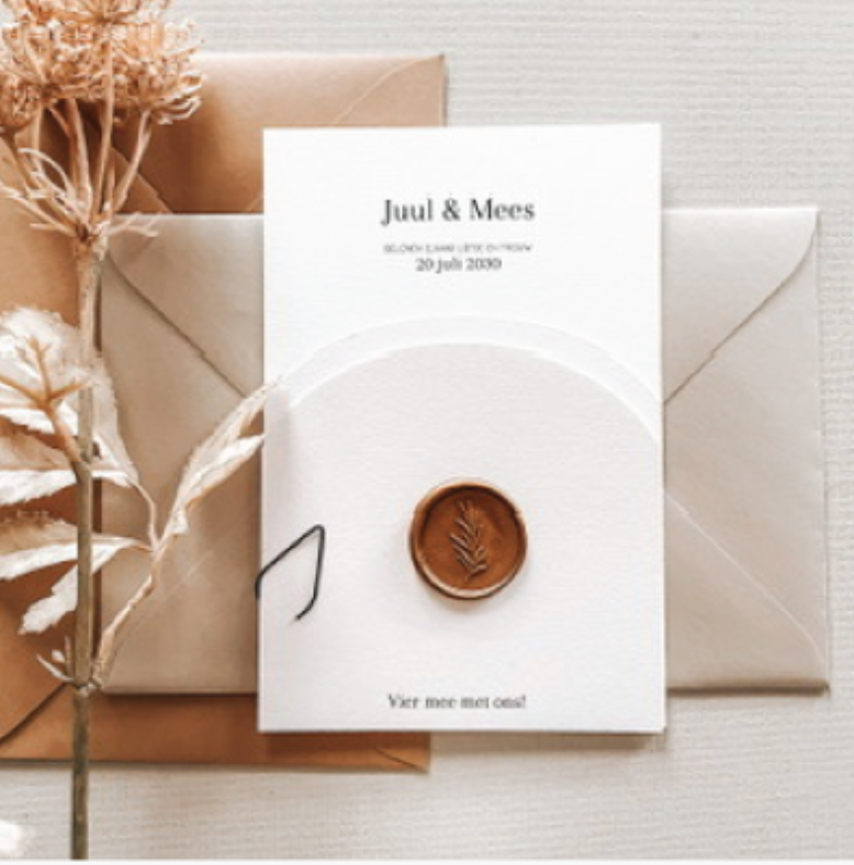 Let op: omdat je kunt kiezen voor verschillende soorten bevestigingsmateriaal, zoals een touwtje of paperclip bestel je het bevestigingsmateriaal van jouw voorkeur los bij de kaart. Wanneer je deze trouwkaart thuis krijgt, zet je ze hiermee zelf in elkaar.