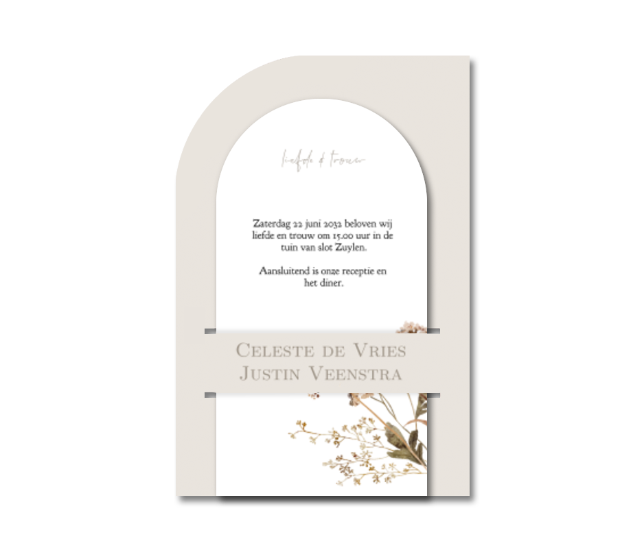 Moderne insteekkaart nude met ronde hoeken en droog bloemen. In de grote kaart zitten 2 rechte stans gaten waar de kleine kaart doorheen gaat.