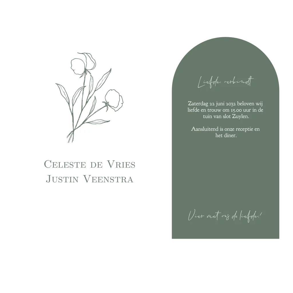 Stijlvolle insteekkaart olive green met ronde hoeken en outline bloem. In de grote kaart zitten 2 rechte stans gaten waar de kleine kaart doorheen gaat.