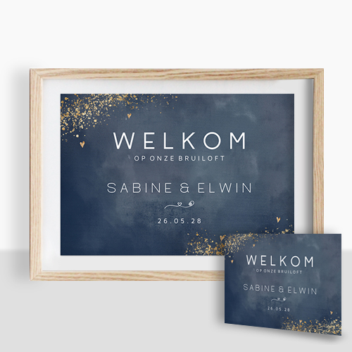 Verwelkom je gasten met een welkomstposter in de stijl van jullie trouwkaart. Navy blue watercolor met goud poeder spetters. Zelf maken.