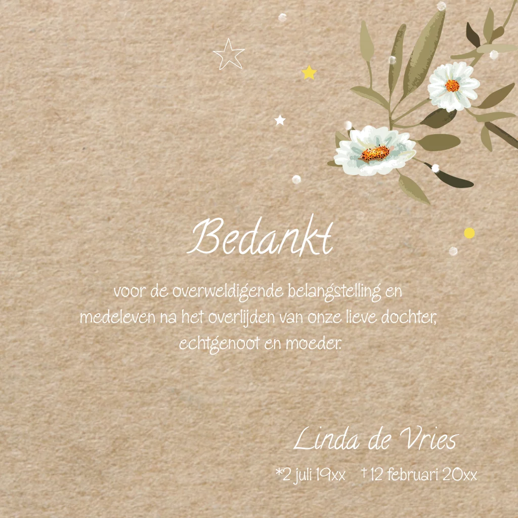 Rustige en stijlvolle bedankkaartje na overlijden. Met kraft look op de ondergrond, groen vallend blad met bloemen omringd met sterren en stippen. Alles is aan te passen.