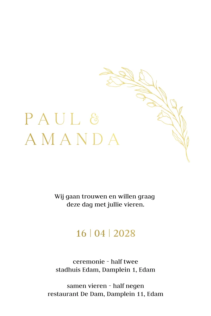 Opzoek naar een moderne rustige trouwkaart in een effe kleur? Met witte ondergrond en goudfolie die jezelf kan aanpassen. Met stans vorm. Zelf maken!
