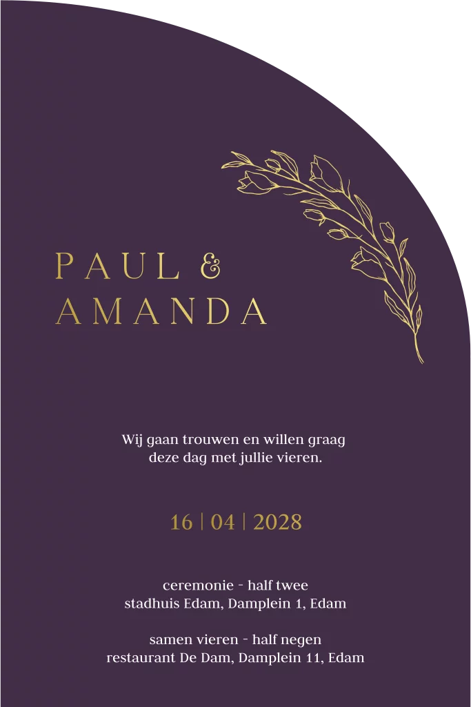 Bijzondere vorm aubergine stans trouwkaart foliedruk