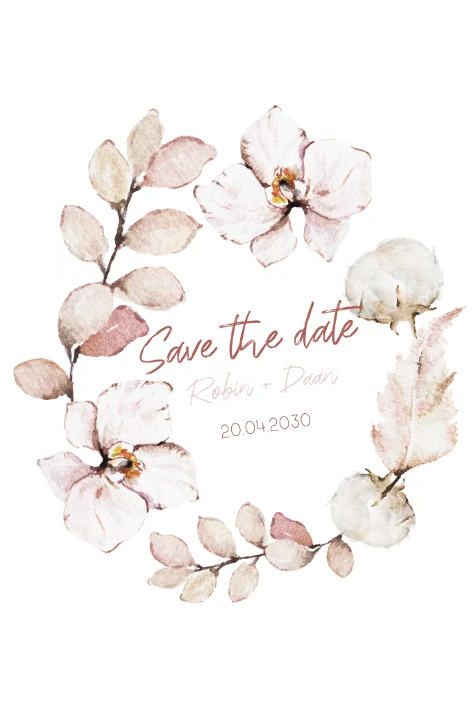 Unieke save the date kaart versturen? Deze kaart in de vorm van een bloemenkrans is echt bijzonder! In de editor pas je de namen, datum en tekst gemakkelijk aan naar jullie eigen wensen! (999999)