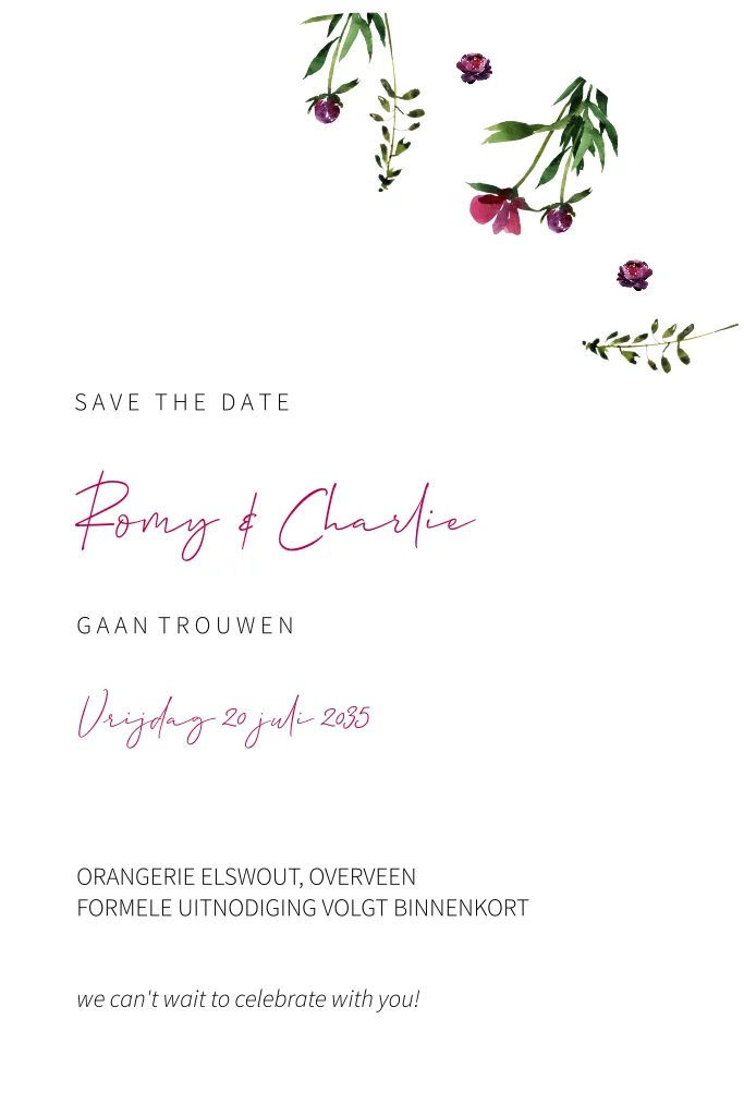 Ben jij op zoek naar een unieke en stijlvolle save the date kaart? Kies dan voor dit mooie kaartje in een boogvorm, prachtige paarse kleuren maken deze kaart extra feestelijk!. (999999)