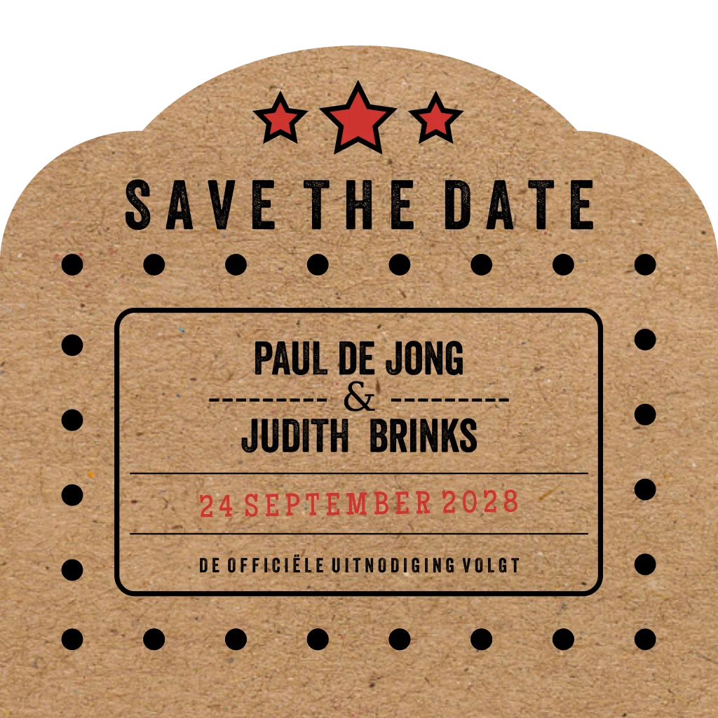 Een festival ticket save the date kaart met een kraft look ondergrond. Een stans kaart in een bijzondere vorm. Pas de kaart aan in kleur en tekst.