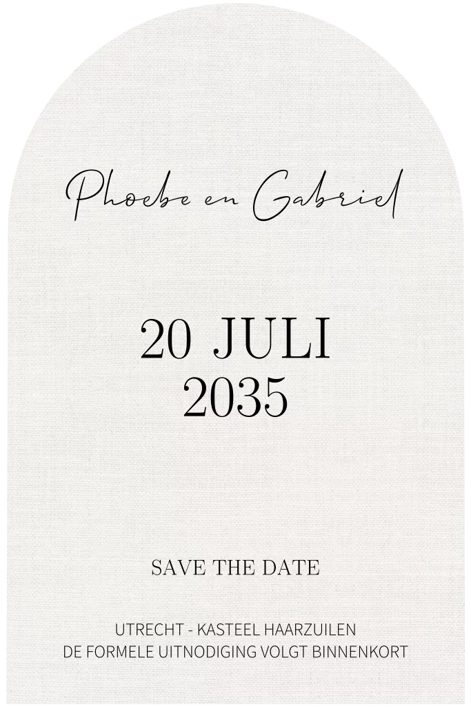 Een stijlvolle en chique save the date kaart met een linnenlook. De tekst mooi vormgegeven in verschillende lettertypes, op een trendy boogvorm kaart. (999999)