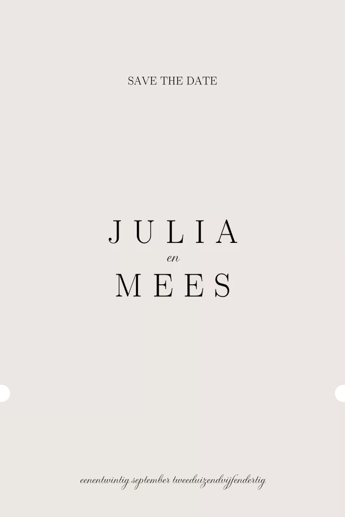 De classy save the date kaart met label, minimalistisch en chic! Bestel een label mee met tekst in goudfolie die je vind bij de producten. Pas de teksten aan in de editor. Het lettertype van de namen op de voorpagina staan nog niet in onze lettertype bibliotheek. Mail ons, dan zetten we de namen in dit font in jullie uitnodiging. (999999)