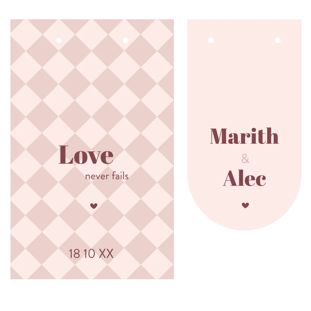 Deze hippe trouwkaart bestaat uit 2 delen en kun je zelf eenvoudig bewerken door de kleuren en teksten aan te passen. Op de hoofdkaart een ruit patroon waarop je de kleinere kaart aan kunt bevestigen met een mooi lint of koordje