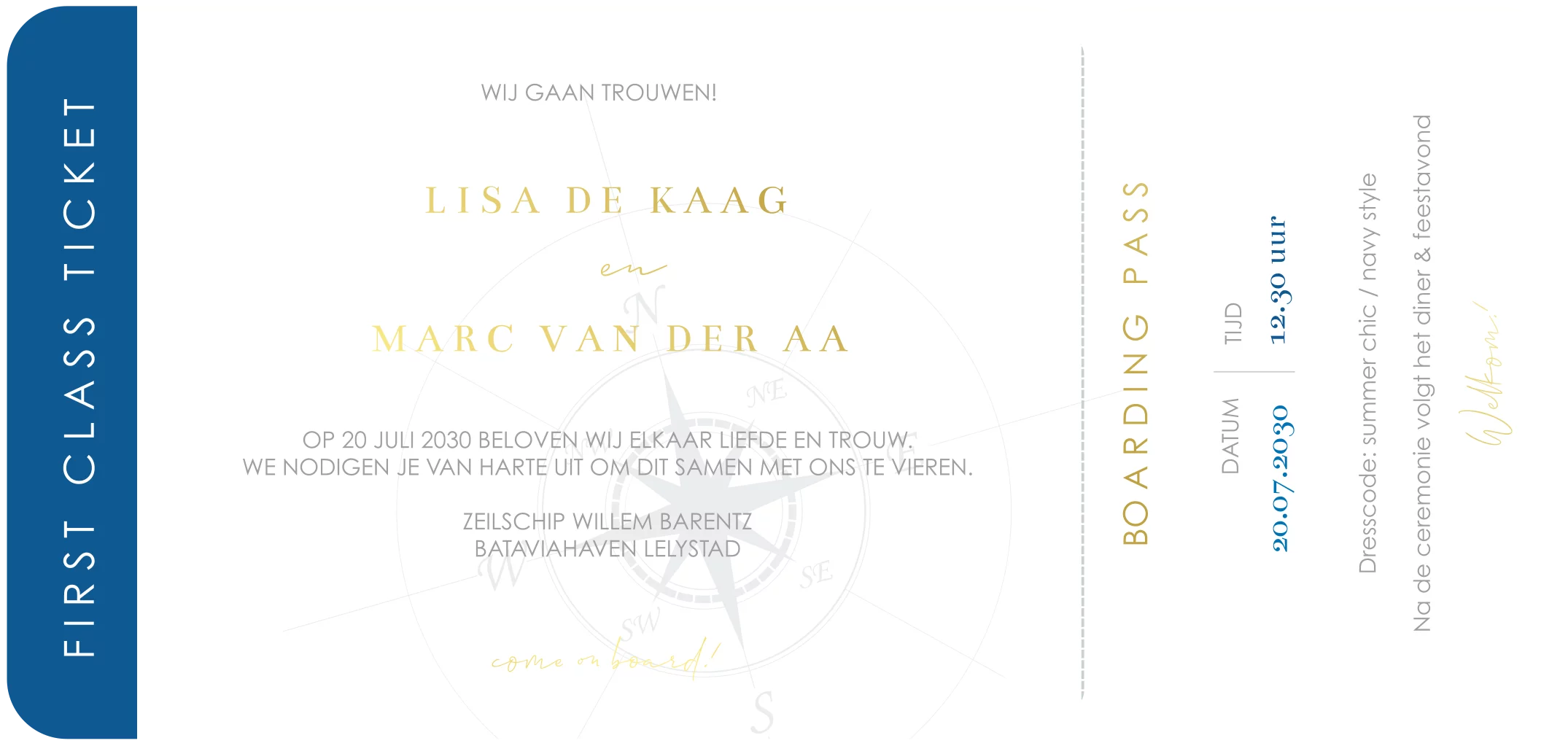 Trouwkaart in vorm van ticket met goudfolie. (999999)