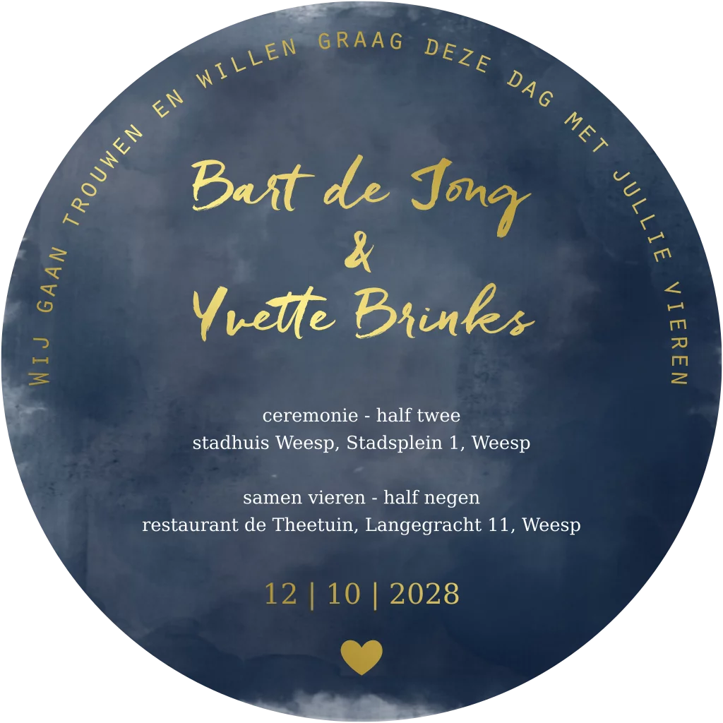 Unieke trouwkaart in een bijzondere ronde vorm met blauwe watercolor navy blue print op de achtergrond. Met foliedruk. Teksten staan los en zijn ook om te kleuren.