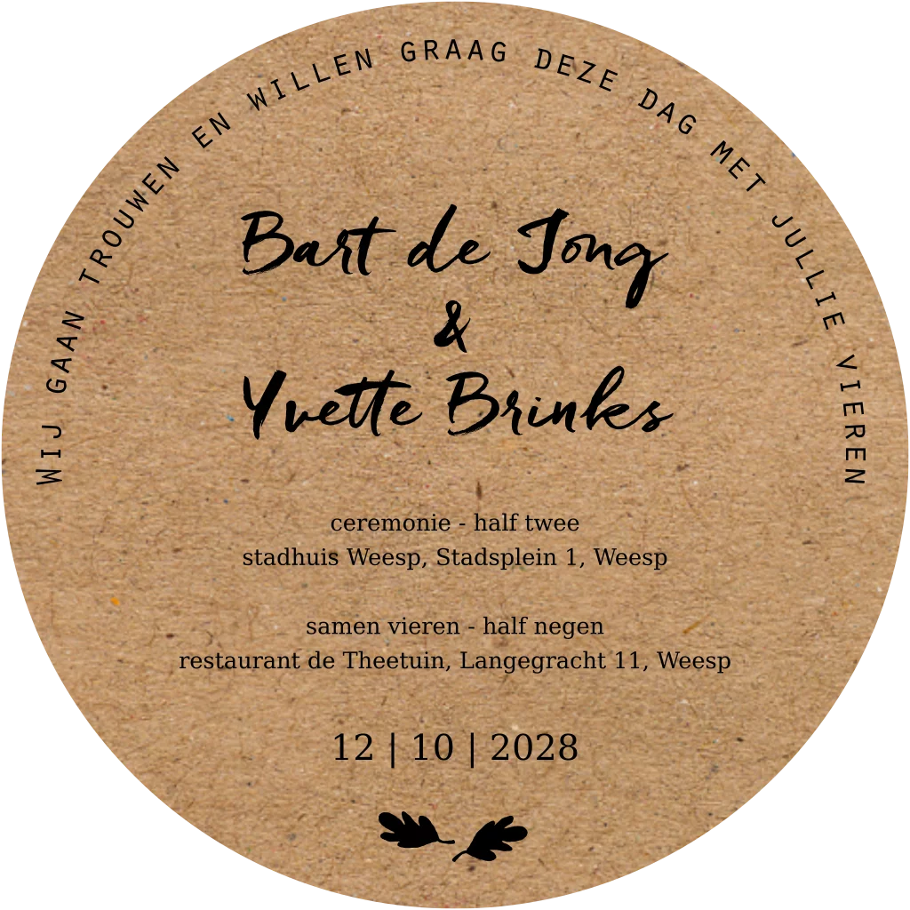 Super leuke en originele trouwkaart in een bijzondere ronde vorm met kraft look print op de achtergrond. Teksten staan los en zijn ook om te kleuren.