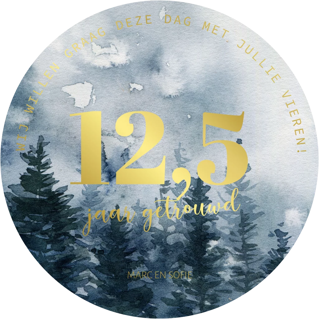Ronde stans uitnodiging voor een een 12,5 jarig jubileum feest met folie en winter achtergrond.