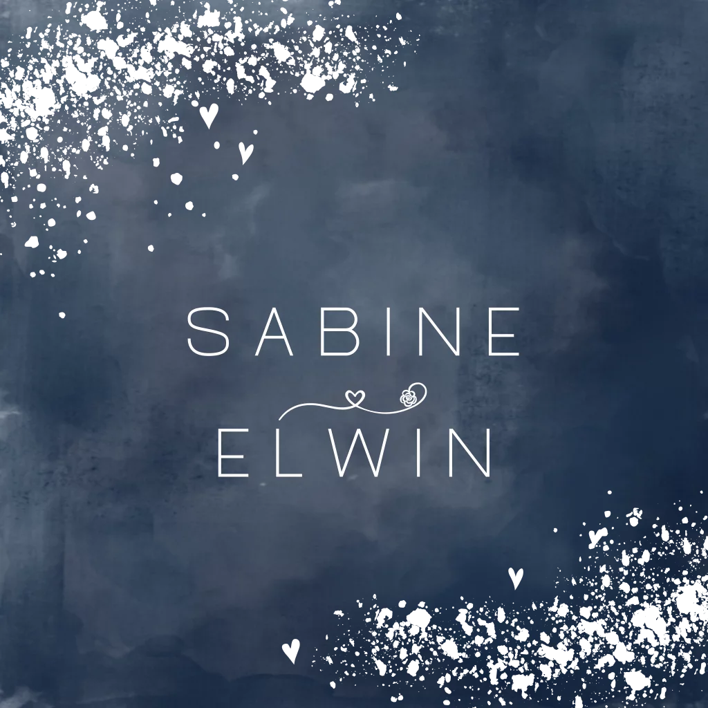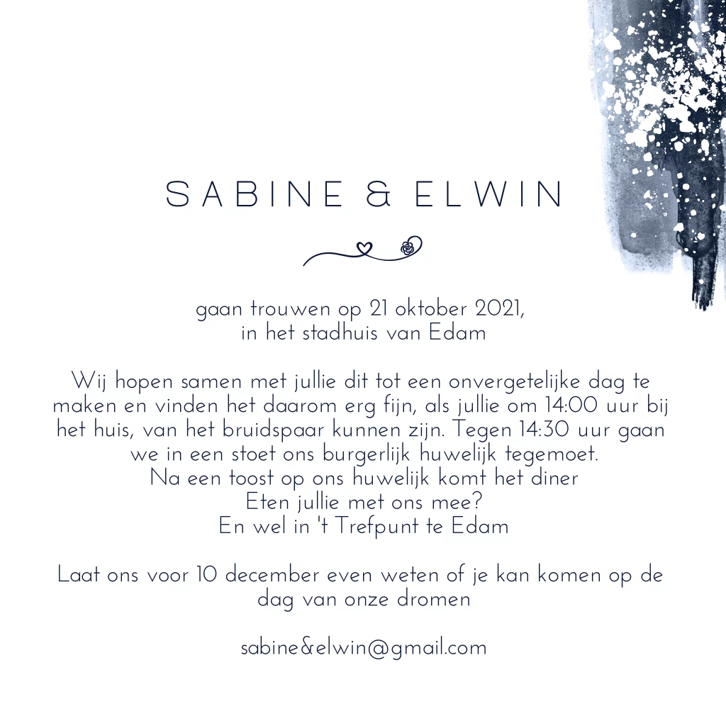 Chique uitnodiging voor jullie huwelijk met echt goudfolie druk? Donkerblauwe verf ondergrond met fijne hartjes en prachtige kwast spetter effect. Alles staat los!