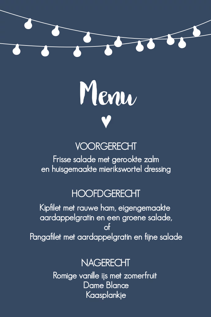 Moderne dinerkaart voor op tafel bij jullie bruiloft? Kaartje met donkerblauwe ondergrond. Hartje, festival lampjes in slinger vorm en alle teksten staan in foliedruk. Zelf maken!