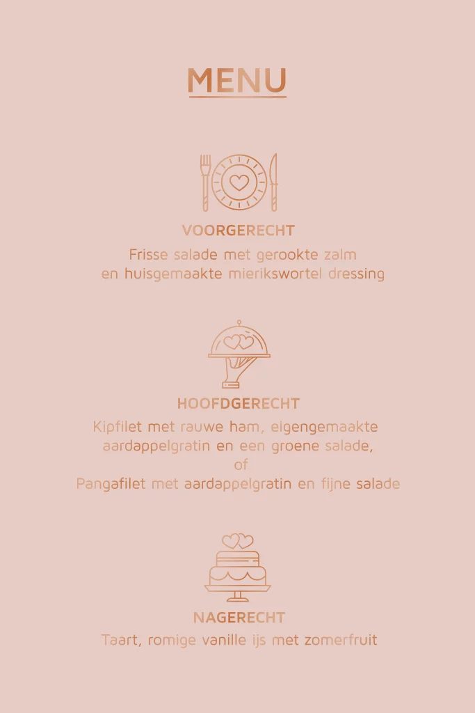 Modern dinerkaart voor op tafel bij jullie bruiloft? Hip rosé kaartje voor menu en drank met tekst en iconen. Alles in echt koperfolie gedrukt. Er zijn veel wedding iconen beschikbaar in onze beeldbank. Alles is zelf te bewerken!