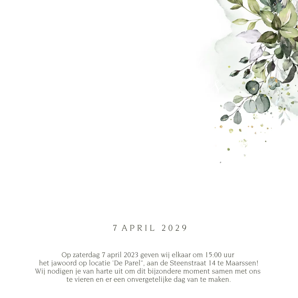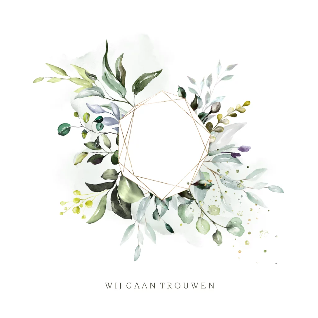 Botanische trouwkaart met een prachtige watercolour bladeren in het groen tinten en écht goudfolie gedrukt. Met de initialen als logo op de voorzijde. Alle wedding iconen zijn te vervangen naar keuze, zie de beeldbank. Ook mogelijk in koper- en zilverfolie.