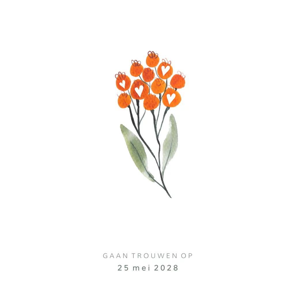 Prachtige enkele vierkante trouwkaart voor jullie huwelijk. Met prachtige sierletters in écht goudfolie druk en subtiel een botanisch blaadje. Alles staat los en er zijn nog veel meer blaadjes in onze beeldbank.