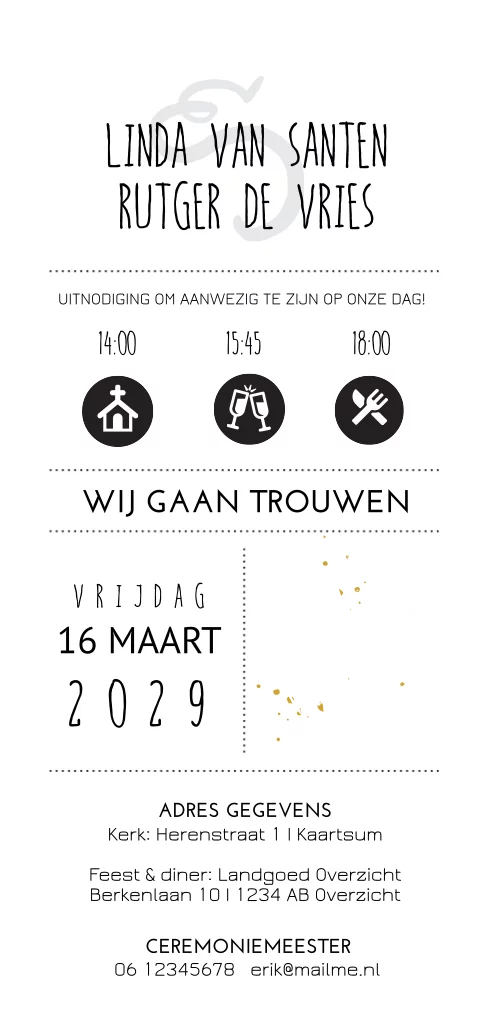 Chic en clean staand trouwkaart met écht goudfolie druk hart, wedding icons, stippellijnen en vlakverdeling op de ondergrond. Zelf tekst aanpassen! Extra lang formaat 10x21cm!