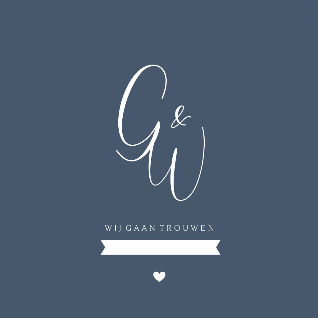 Hippe trouwkaart met een prachtige warme donkerblauwe ondergrond en met écht goudfolie gedrukt. Met de initialen als logo op de voorzijde. Alle wedding iconen zijn te vervangen naar keuze, zie de beeldbank. Ook mogelijk in koper- en zilverfolie.
