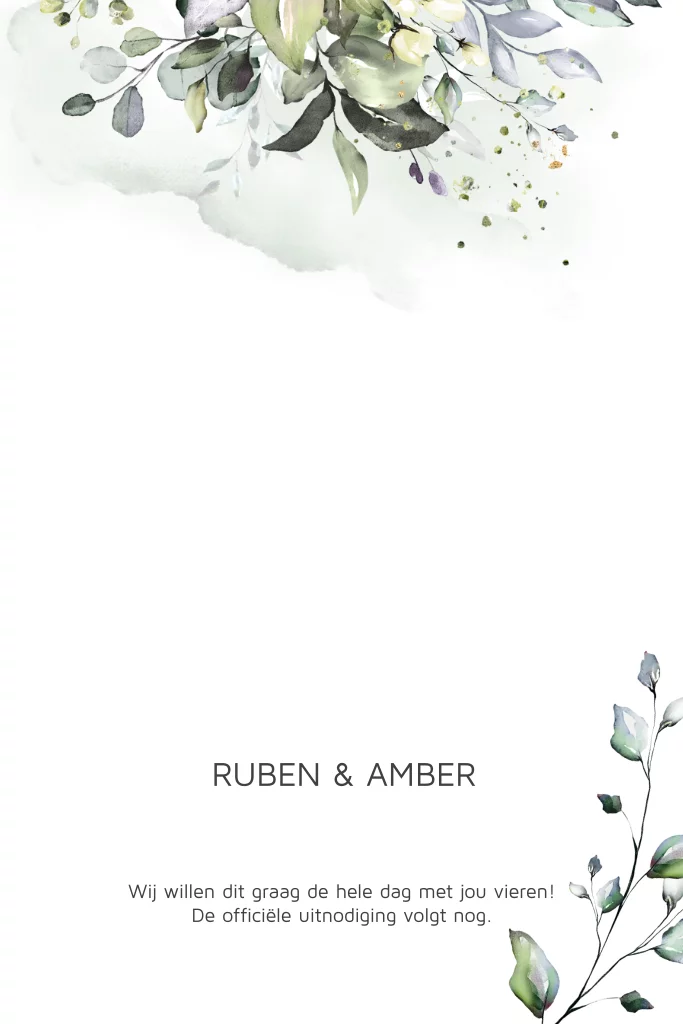 Unieke enkele save the date trouwkaart met écht goud foliedruk. Met groene watercolour en met speels geplaatste groene boeket takken. Ook mogelijk in zilver- en koperfolie druk. Zelf maken!