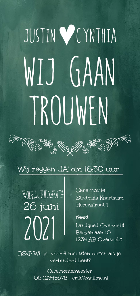 Moderne enkele goudfolie druk grafische trouwkaart met out-line bloem, lijn, hartje en losse teksten. Ondergrond groene watercolor. Extra lang formaat 10x21cm.