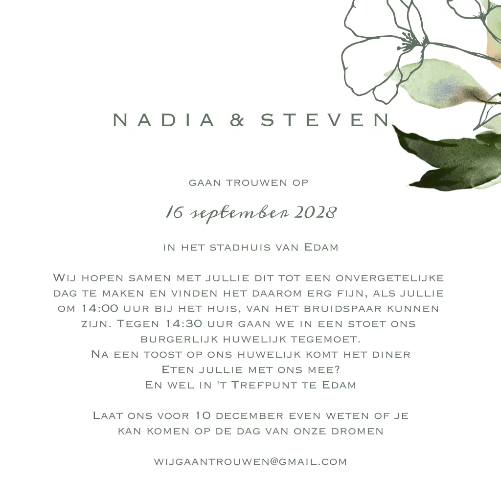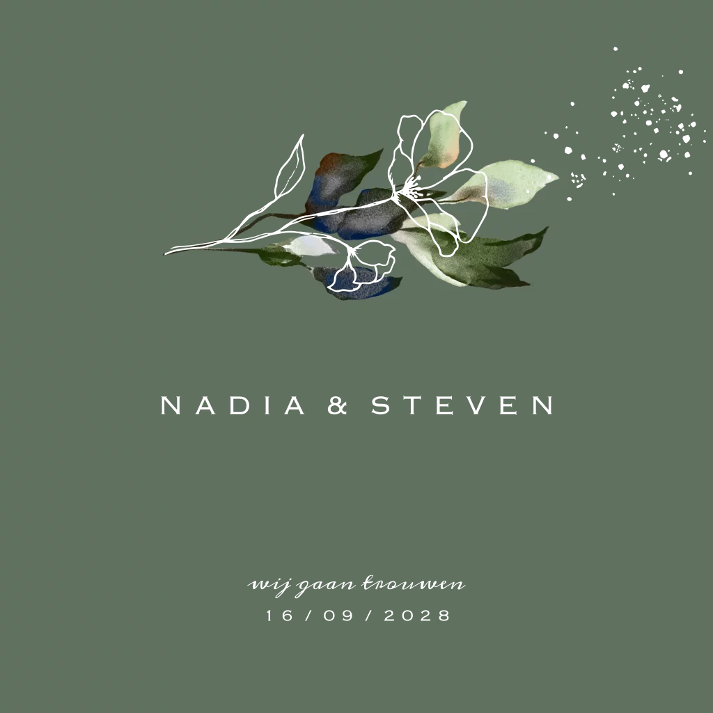 Chique Watercolor Greenery trouwkaart voor jullie huwelijk? Met donkergroene ondergrond met prachtige goudfolie gekleurde bloem en watercolor blad. Alles staat los!