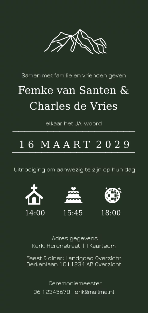 Chique staande trouwkaart met echt goudfolie op de voorzijde. Met bergen, wedding icons en lijnen. Zelf tekst aanpassen! De donkergroene kleur is aan te pasen naar wens! Formaat 10x21cm