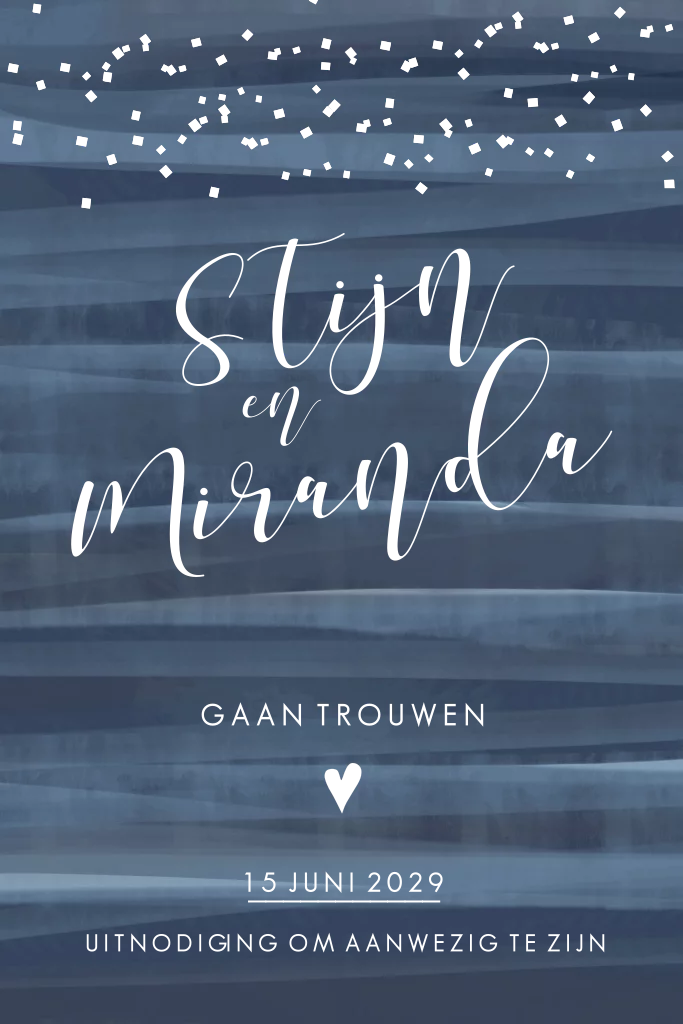 Prachtige enkele save date kaart met écht goudfolie druk voor jullie trouwdag! Met donkerblauwe watercolor ondergrond en goudfolie confetti. Zelf teksten toevoegen.