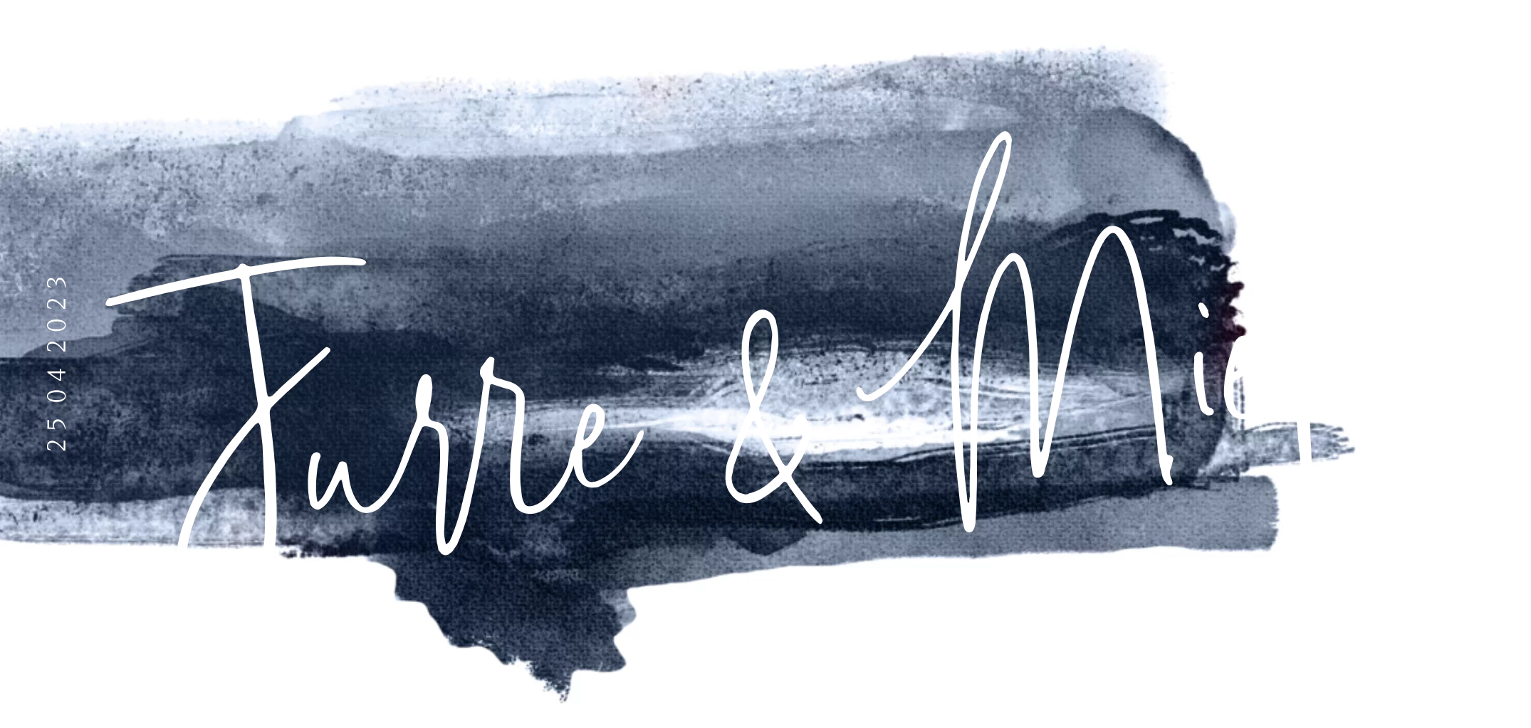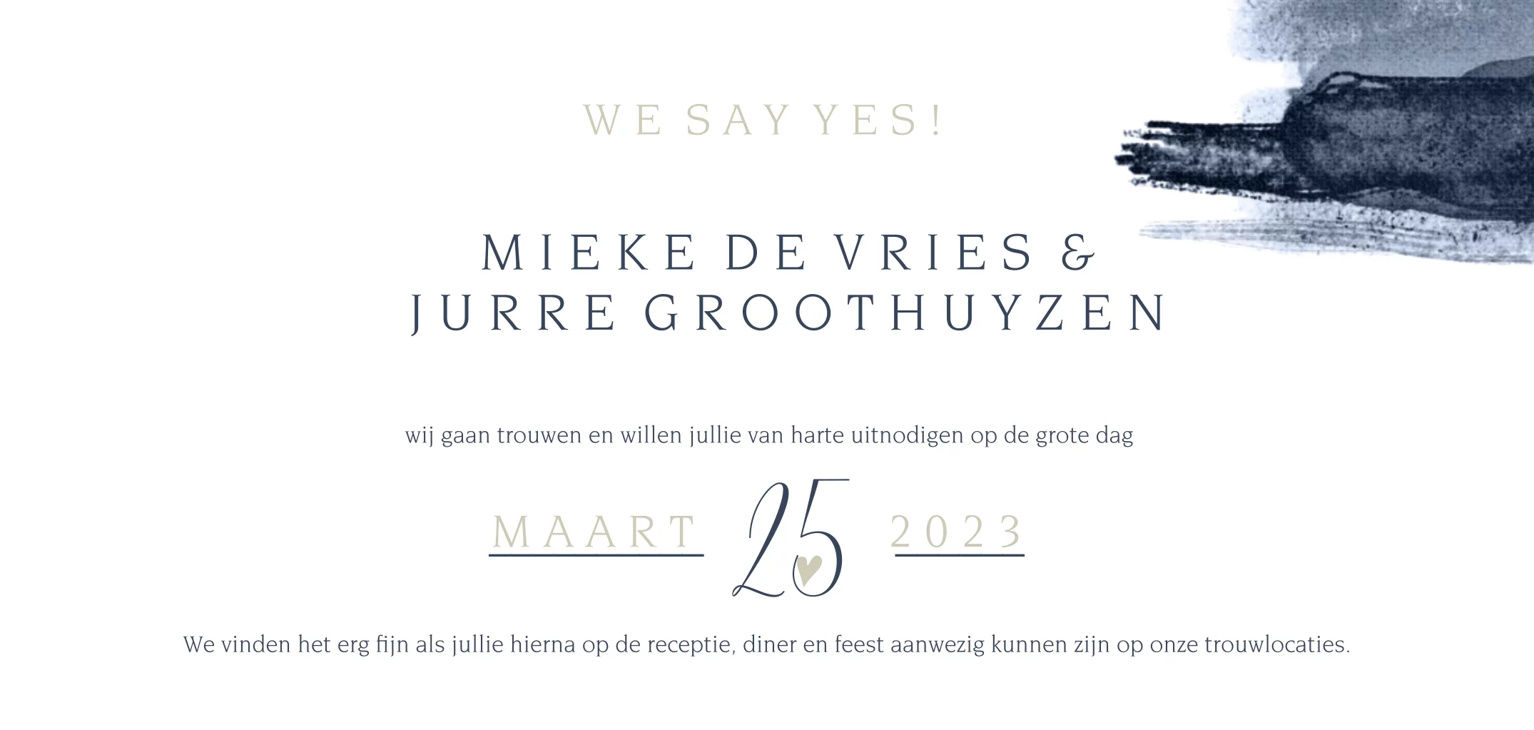 Chique dubbele panorama trouwkaart met een prachtige verf penseel streep op de voorzijde in een donkerblauwe kleur. Met de namen en hartjes in écht goudfolie gedrukt. Alles staat los en is zelf te bewerken.