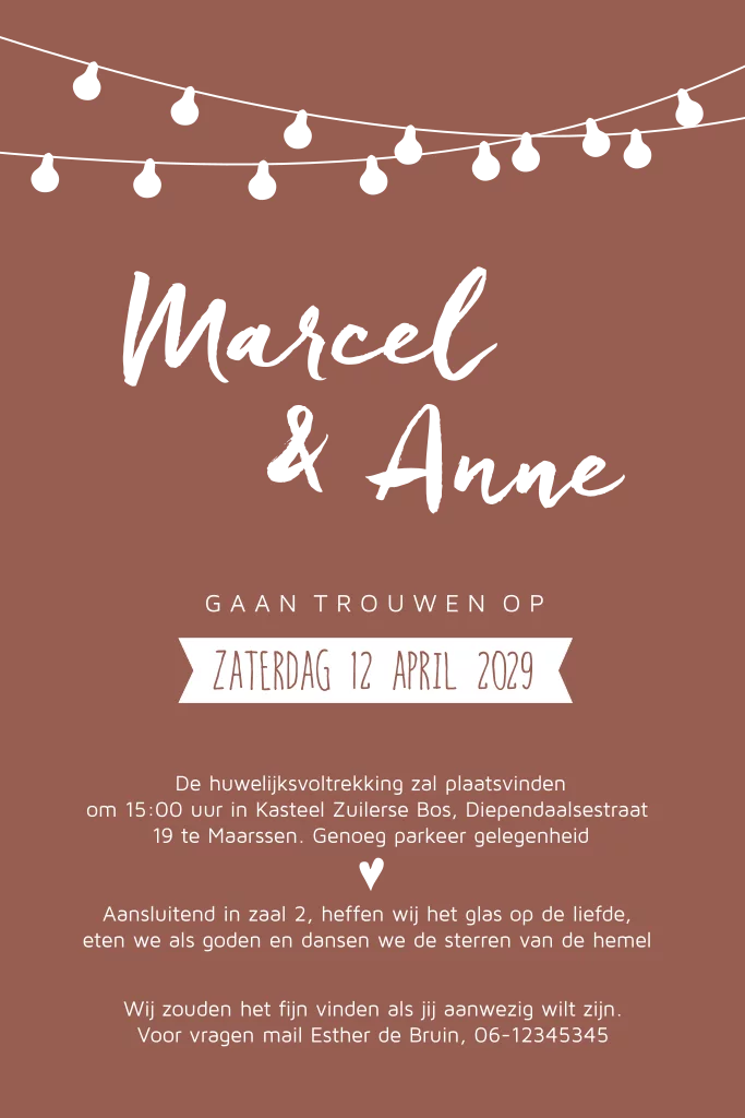 Hippe staande trouwkaart in meerdere formaten beschikbaar. Met feestelijke festival lampjes in écht rosé folie gedrukt. De ondergrond is nu steenrood maar aan te passen naar wens. Ook mogelijk met goud-, zilver- en koperfolie.