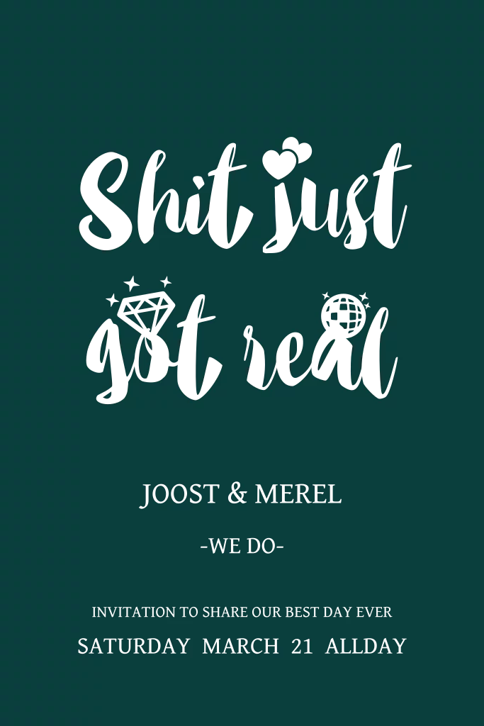 Grappige trouwkaart gedrukt met folie. Tekst 'shit just got real' en andere voorbeeldtekst. Verander de kleur naar eigen wens.